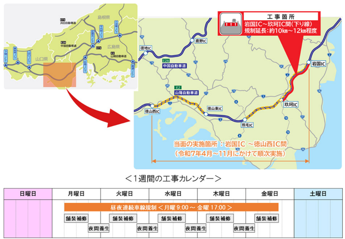 ※E2 山陽自動車道 岩国IC~徳山西ICの上記区間以外についても令和7年4月から11月にかけて舗装の高耐久化を