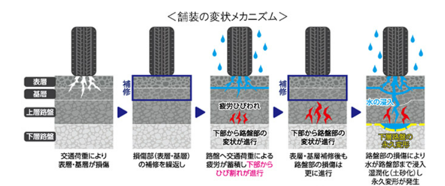 従来の舗装補修では、表層に発生した損傷に対して補修を繰り返し実施してきました。しかし、近年では路面に土砂が吹き出す現象や、路盤におよぶひび割れの発生などの変状が生じており、短い期間で新たな変状が再発し、補修頻度が著しく高くなるといった問題が生じていました。