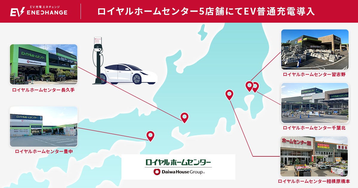 ENECHANGE(エネチェンジ)株式会社(本社:東京都中央区、代表取締役CEO:丸岡 智也)は、大和ハウスグループのロイヤルホームセンター株式会社(本社:大阪市西区、代表取締役社長:中山正明、以下:ロイヤルホームセンター)の5店舗に合わせて20口の6kW普通充電器「EV充電エネチェンジ」を設置し、運用を開始したことをお知らせします。