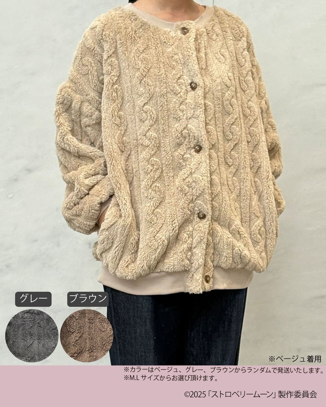 ボア素材ながら、ケーブルニットのような編み目のデザインがキュートなカーディガン。