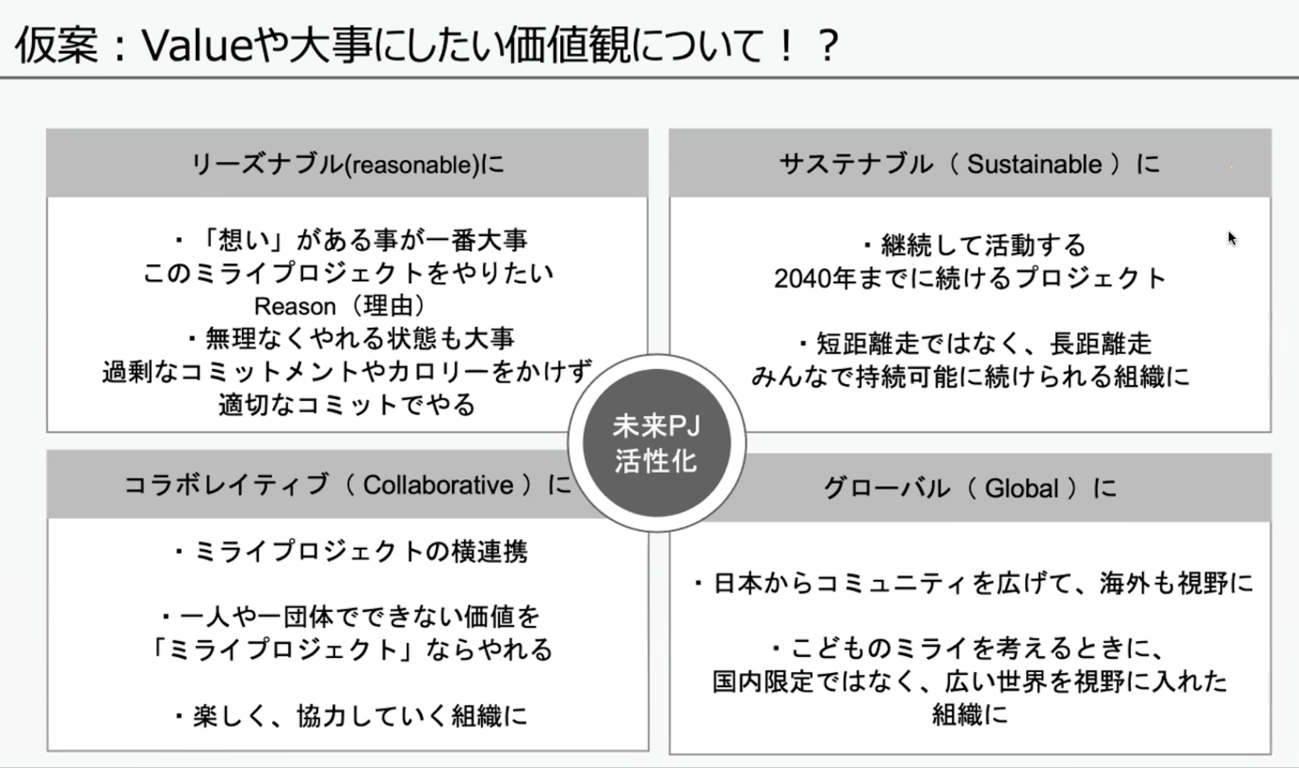 未来プロジェクト「こどもの未来」「食の未来」「科学の未来」「メディアの未来」の代表、CXOからビジョン・ミッションや行動計画など『発表会』を開催。仲間集め、プロジェクト推進を一層本格化。合同合宿も実施