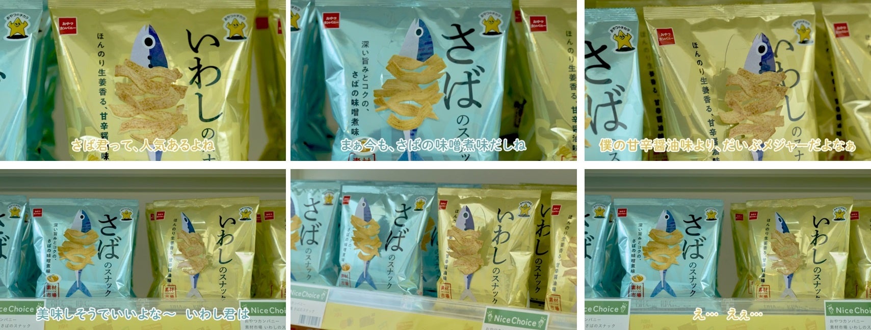 ”おさかな”のスナック菓子であることを伝えるため、青魚のようにキラキラと輝く色とともに「いわし」「さば」のイラストが目を引くパッケージは、店頭でも異彩を放っています。そんな店頭でも目を引くパッケージの「いわし」と「さば」の想いがつい出てしまったWEB動画が完成。6袋入りマルチパックタイプの登場にあわせ、2023年10月30日(月)より『素材市場』ブランドサイトにて公開します。