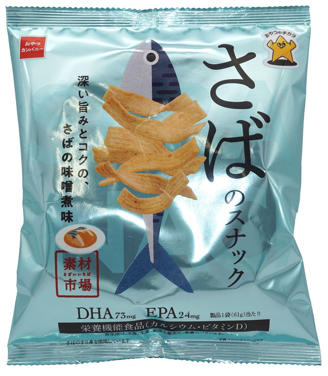 DHA、EPAの栄養素を手軽に摂れる栄養機能食品(カルシウム)の『素材市場 さばのスナック』は、さば料理の定番”味噌煮”をイメージし、さばを生地にたっぷりと練り込み、深い旨みとコクのある味噌煮味に仕上げました。