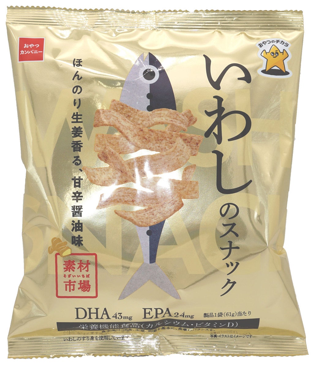 「日経トレンディ(2022年12月号)」菓子部門の2022年ヒット商品としてもお取り上げいただいた『素材市場 いわしのスナック』は、DHA、EPAに加えて、カルシウム、ビタミンDも摂れる栄養機能食品(カルシウム)で、いわしを生地にたっぷりと練り込み、さらに生姜パウダーも加えることでいわしの素材本来が持つ香りや風味を活かしつつも、生姜の風味が際立ったさっぱりとした味わいに仕上げています。