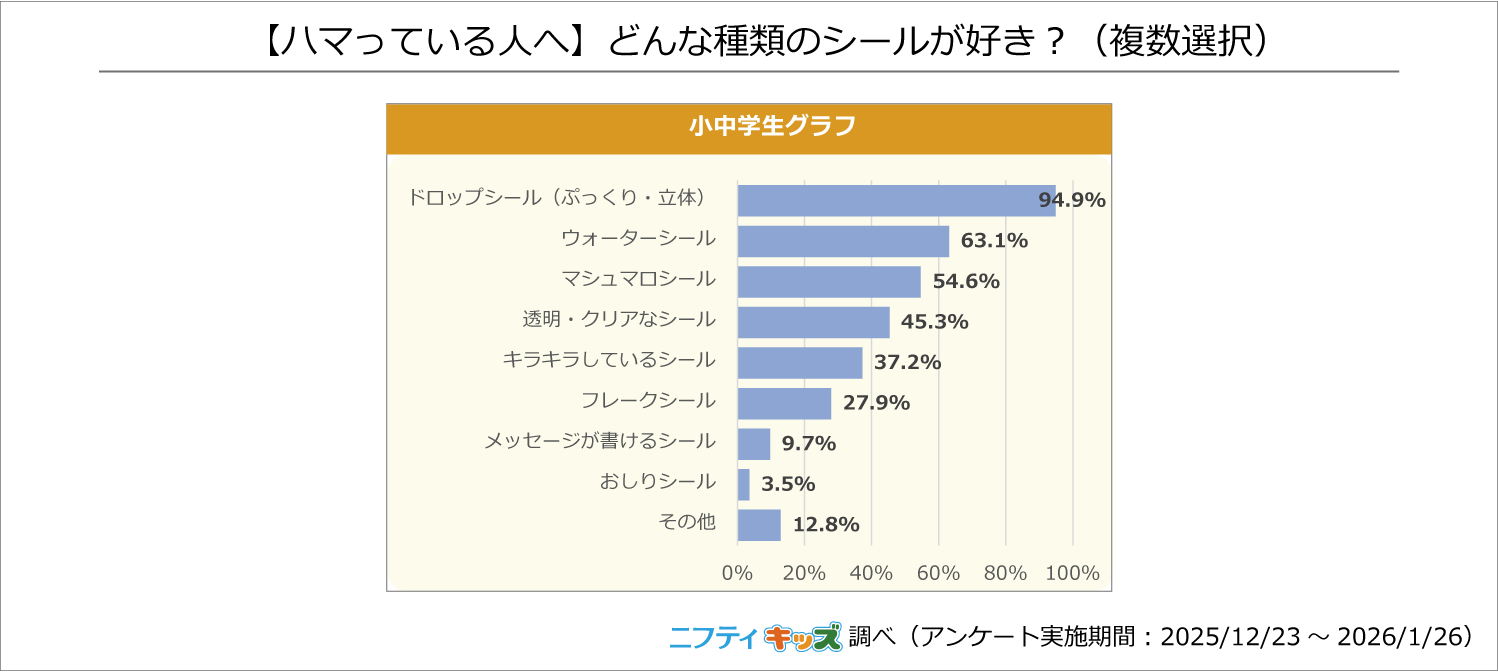 7割以上の小学生がシール集めに「ハマっている」と回答しました。一方で、中学生では「ハマっている」人は半数を切り、世代によってブームの広がり方に違いがあることがわかりました。