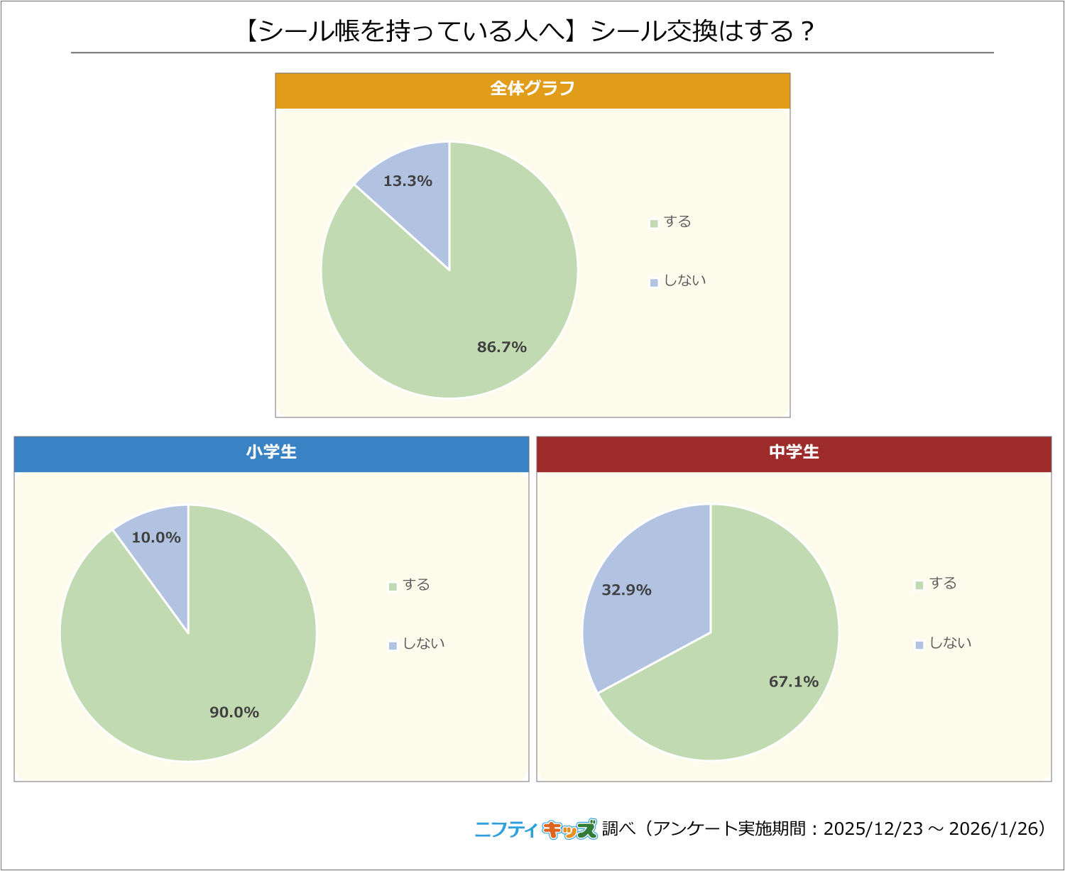 「する」と回答した人の割合は、小学生では90%、中学生では67.1%でした。シール帳を持っている人の多くは、シール交換も楽しんでいることがわかります。