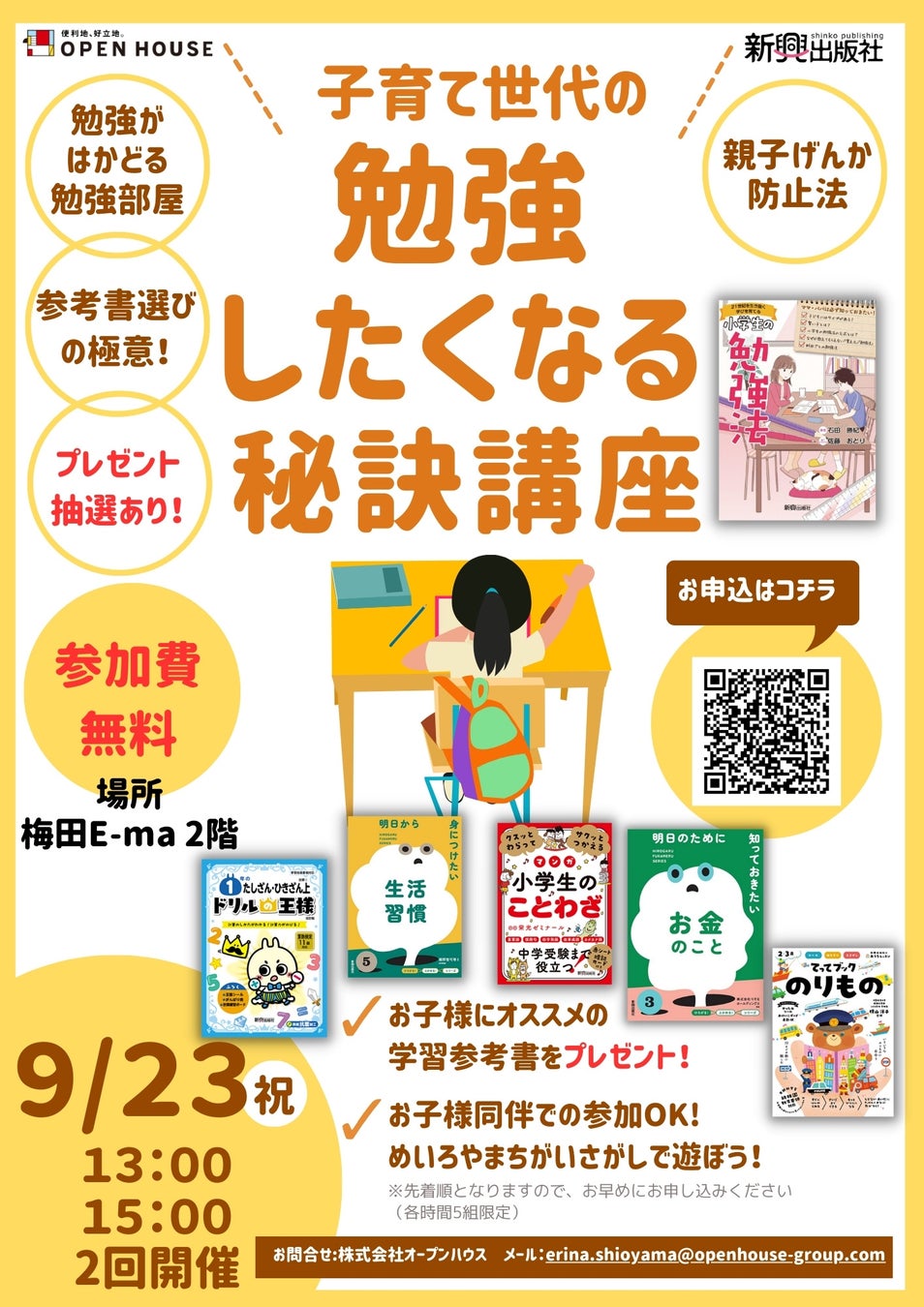 株式会社オープンハウスグループ(本社 東京都千代田区、代表取締役社長 荒井正昭、以下「当社」)は、株式会社新興出版社啓林館(本社 大阪府大阪市、代表取締役社長 佐藤諭史)とタイアップし、2023年9月23日(土)に大阪で、大人も子どもも学べる特別講座「勉強したくなる秘訣講座」を開催いたします。