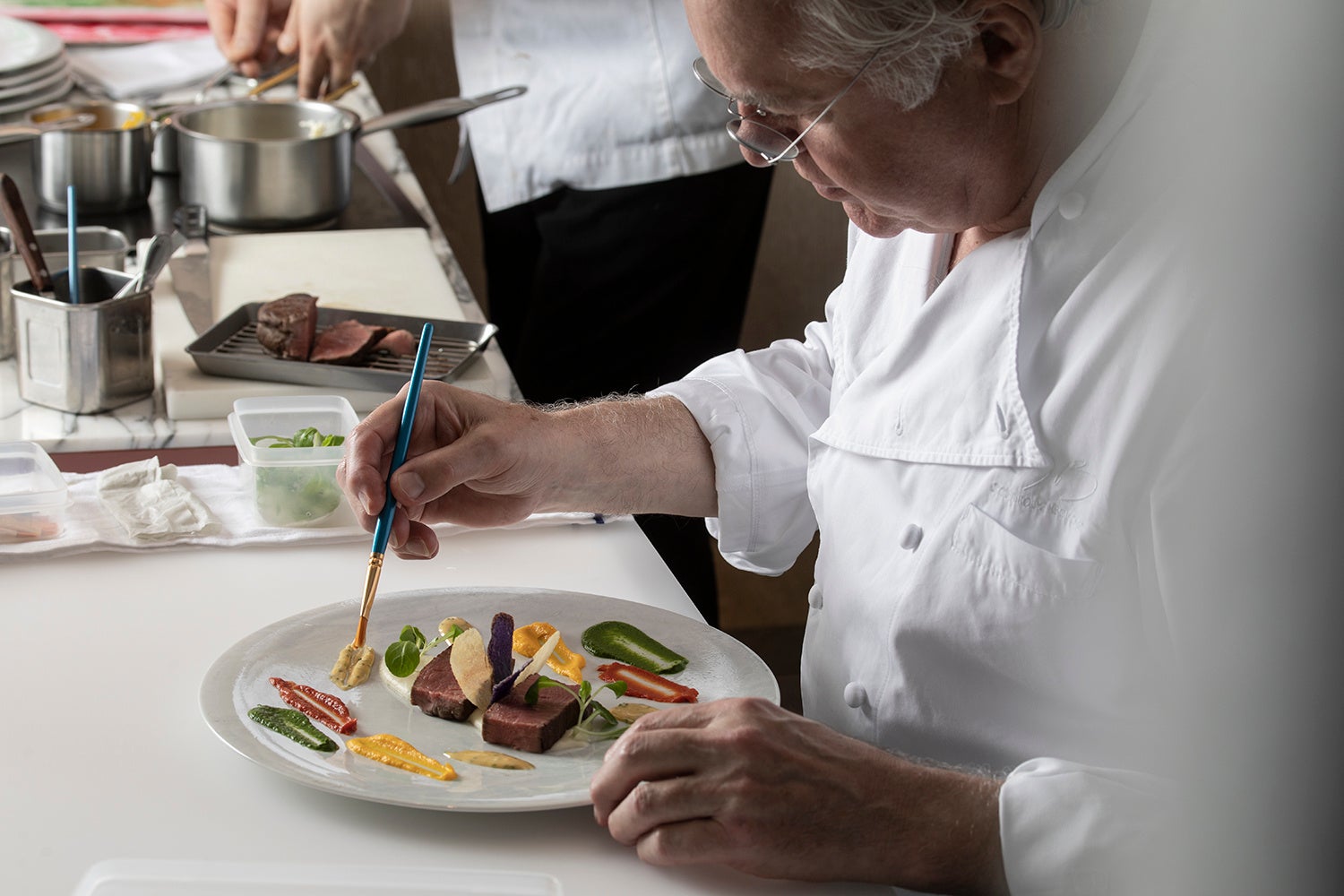 2018年に始まった“ART BRUT”プロジェクトは、今回で6度目の開催となります。フランスではアールブリュットが「障がいのある方々の芸術」として広く支援され、社会に多様な価値観を広げています。シェフ ドミニクはその理念に共鳴し、クロスチームとの出会いからこのプロジェクトを始動しました。チャレンジド・デザイナー®が描いたアート作品を、プロのデザイナーがデザイン画に仕上げ、そのモチーフから特別なメニューを創作しています。また、「夢のかたちファーム」で育まれた野菜を料理に取り入れることで、自然の恵みと人の創造性を同じテーブルで味わっていただけます。