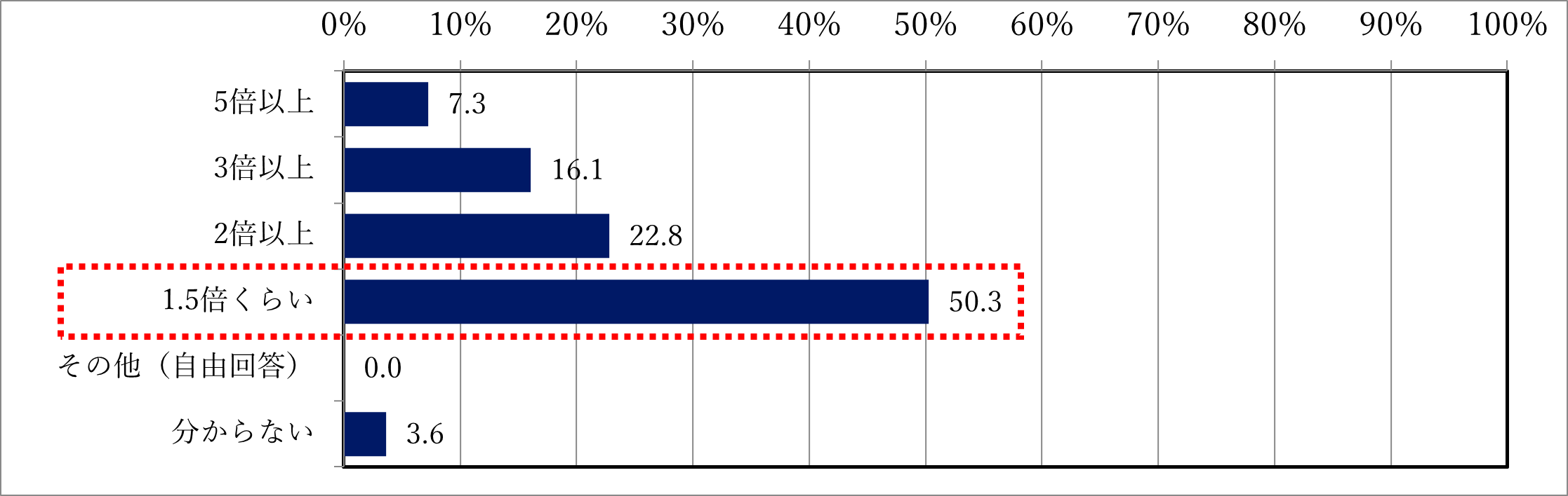 「コスメ購入が増えた」と回答した人の半数(50.3% 97名)が、「購入金額は1.5倍になった」と回答。