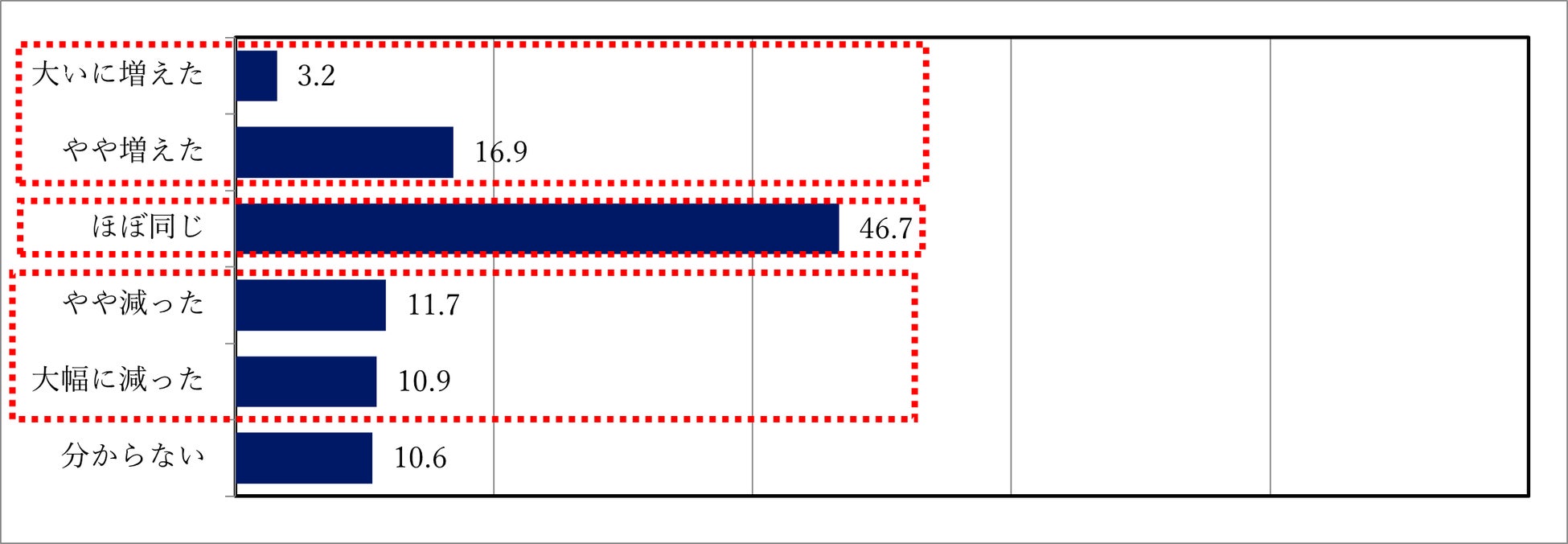 「ほぼ同じ」と回答する人が一番多く、46.7%(448名)、「やや減った」と「大幅に減った」が合わせて22.6%(217名)、「大いに増えた」と「やや増えた」が合わせて20.1%(193名)。減ったと答えた人が増えたと答えた人より多かったのはコロナが5類に変わった今年、行動の幅が広がり、渦中には実現しなかったレジャーや旅行などへの出費が増えた結果とも考えられる。