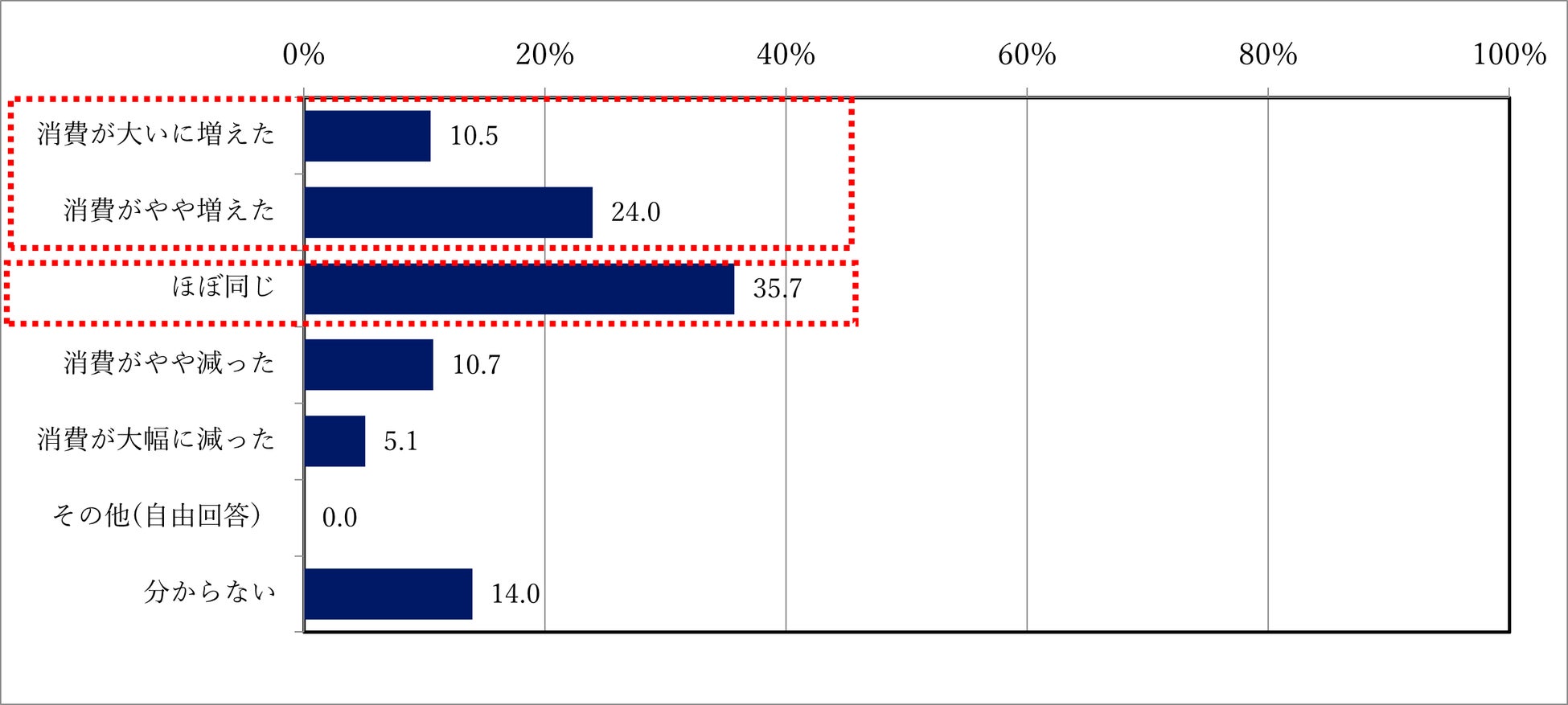 2020~2022年の3年間と比較して、今年の消費行動は「ほぼ同じ」と回答した人が一番多く35.7%(343名)。「消費が大いに増えた」、「消費がやや増えた」と回答した人が合わせて34.5%(331名)。