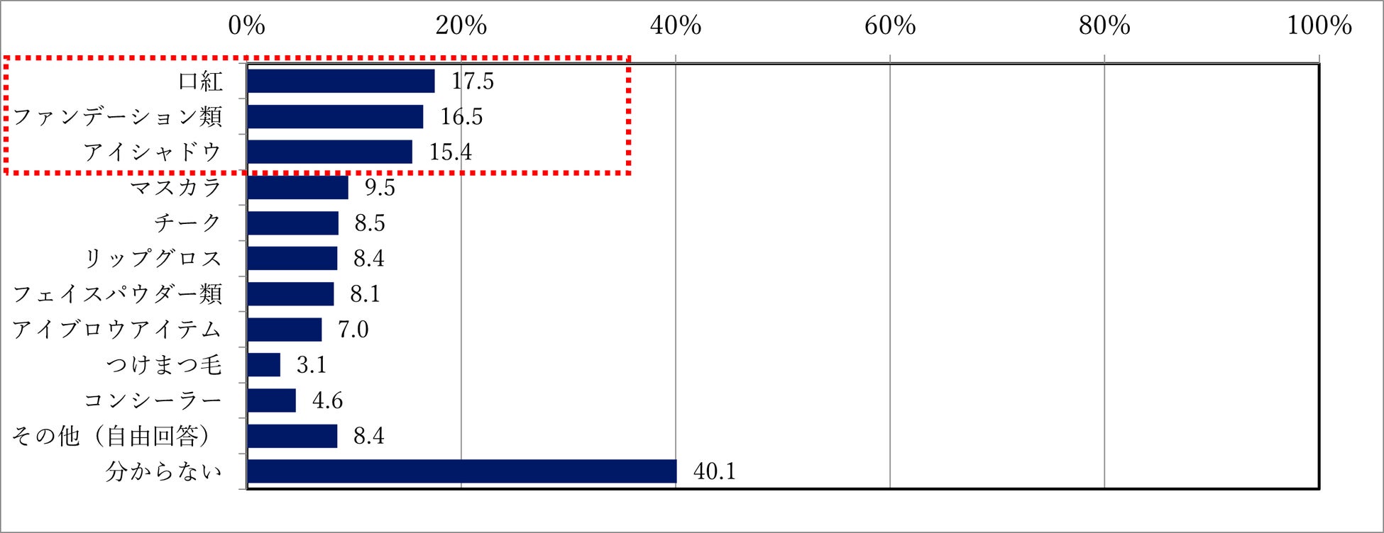1位が口紅、次にファンデーション類、アイシャドウと続く。口紅、ファンデーションはマスクを外した影響。アイシャドウはマスクをしていても使っていたのでは、との疑問を持つが、マスクを外し全体的にしっかりメイクをするようになった結果がしばらくぶりのアイシャドウの購買につながったとも考えられる。