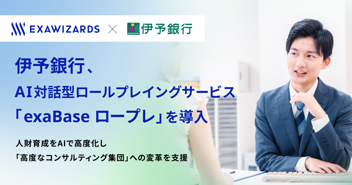 株式会社エクサウィザーズ(東京都港区、代表取締役社長CEO:春田 真、以下エクサウィザーズ)は、株式会社伊予銀行(愛媛県松山市、頭取:三好 賢治、以下伊予銀行)が、AI対話型ロールプレイングサービス「exaBase ロープレ」を導入したことをお知らせいたします。非対面有人窓口を運営するダイレクトコンサルティング部に従事する約80名のメンバーで利用を開始し、AIを活用した高頻度な対話演習を通じて、職員一人ひとりの対話品質とコンサルティング力の向上を目指します。