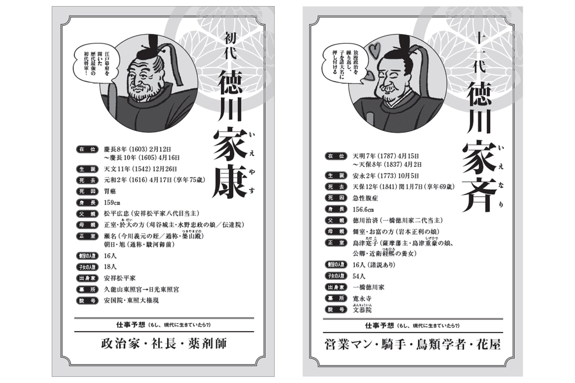 側室や子供の人数、身長や死因、もし現代に生きていたら向いている職業予想などを綴った、15代将軍全員のプロフィールは必見です!