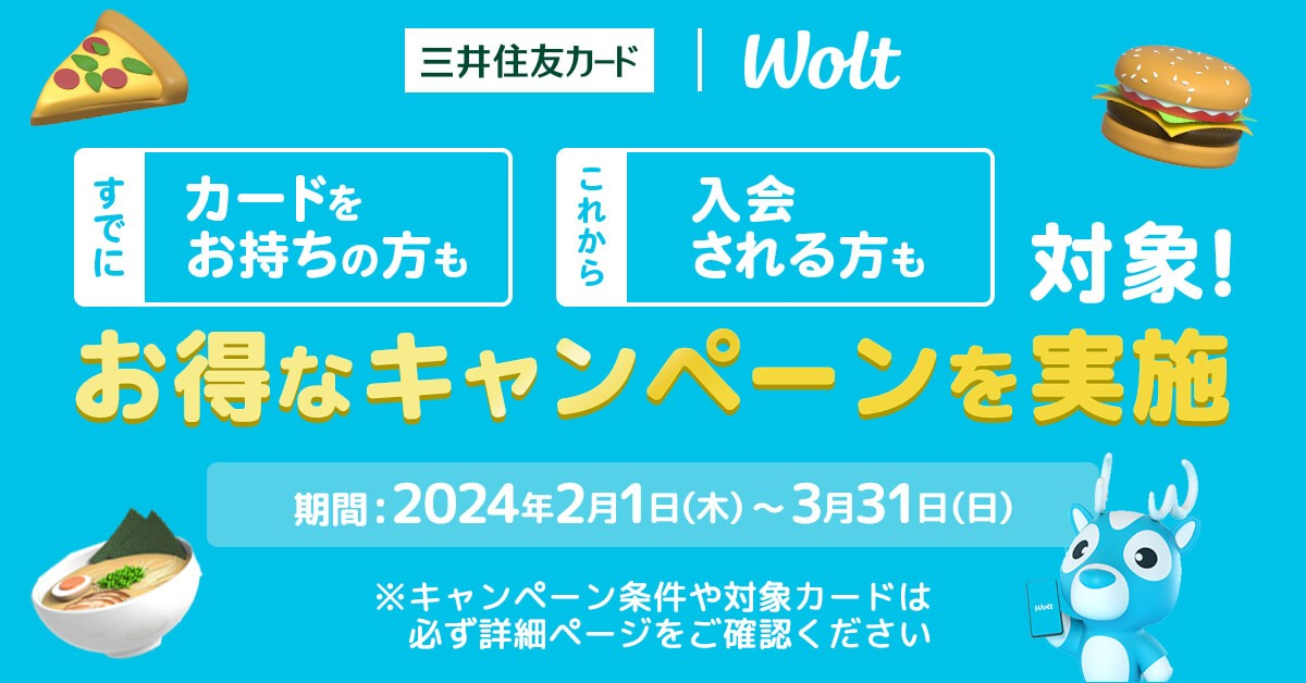 本キャンペーンページから三井住友カードの対象カードに新規ご入会いただくと、3,000円分のWolt割引クレジットがもらえる!