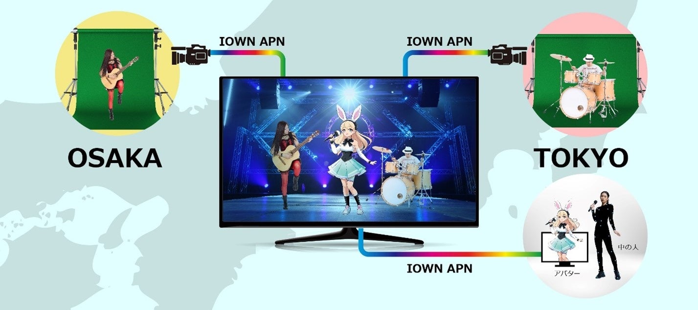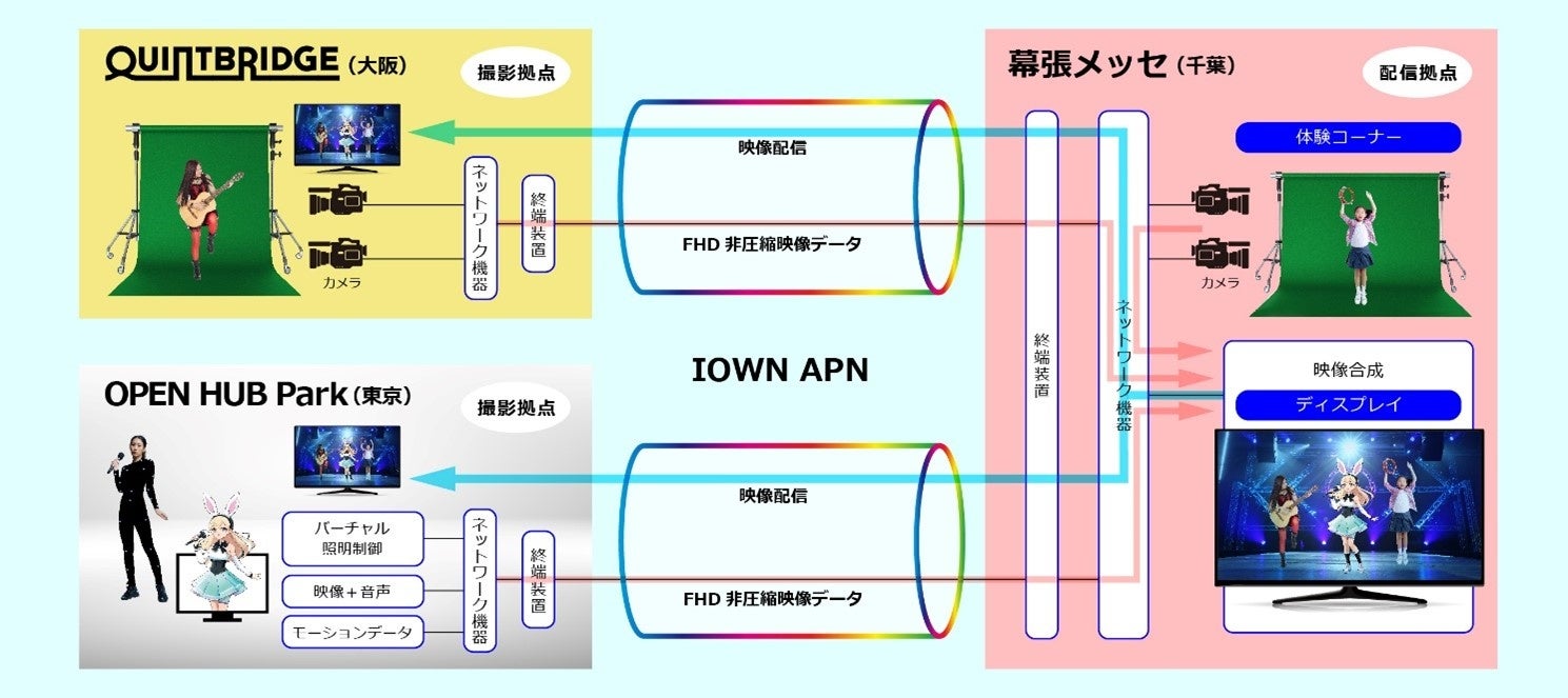 Interop会場である“幕張メッセ”と大阪“QUINTBRIDGE”、東京“OPEN HUB Park※4”の3拠点をIOWN APNで接続し、幕張メッセとQUINTBRIDGEにいる出演者と、OPEN HUB ParkのVTuberがあたかも同じ場所で収録しているような映像を制作し、配信します。回線速度としては、東京-大阪間約700㎞を、遅延5msec以下で接続します。