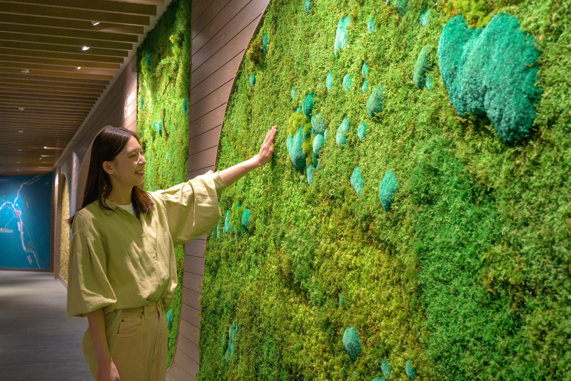 苔アートウォールは、パブリックエリアの渓流-BASEに設置されていて、宿泊者はいつでも苔の潤い、触感、色合いを楽しめます。ふわふわとした苔の質感を楽しんだり、そのデザインを覗き込んだりして、小さな自然の奥深い世界を味わうことができます。見て触って楽しんだあとは、渓流コンシェルジュとともに「苔さんぽ」に出かけて渓流を散策したり、こけ玉を制作したり、苔のさらなる魅力を知ることができます。