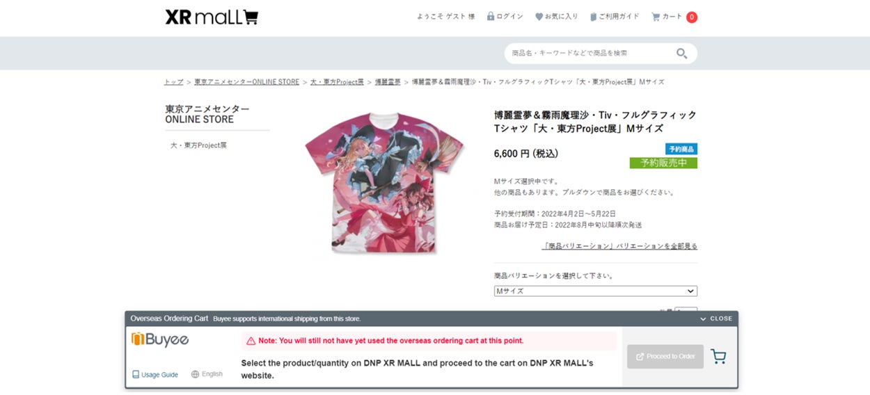 同時に、DNPが運営するECサイト「XR MALL」上の「大・東方Project展」ページでは企画展で販売されているイラストレーターによる美麗なキービジュアルを使用したTシャツやタペストリー、アクリルアートスタンドなどのグッズを扱っています。海外にも多数のファンを持つ「東方Project」の商品を世界へお届けするため、サイトの優れたUIや世界観を維持したまま海外のユーザーにオンラインショッピングをお楽しみいただけるよう、「Buyee Connect」を導入いただきました。