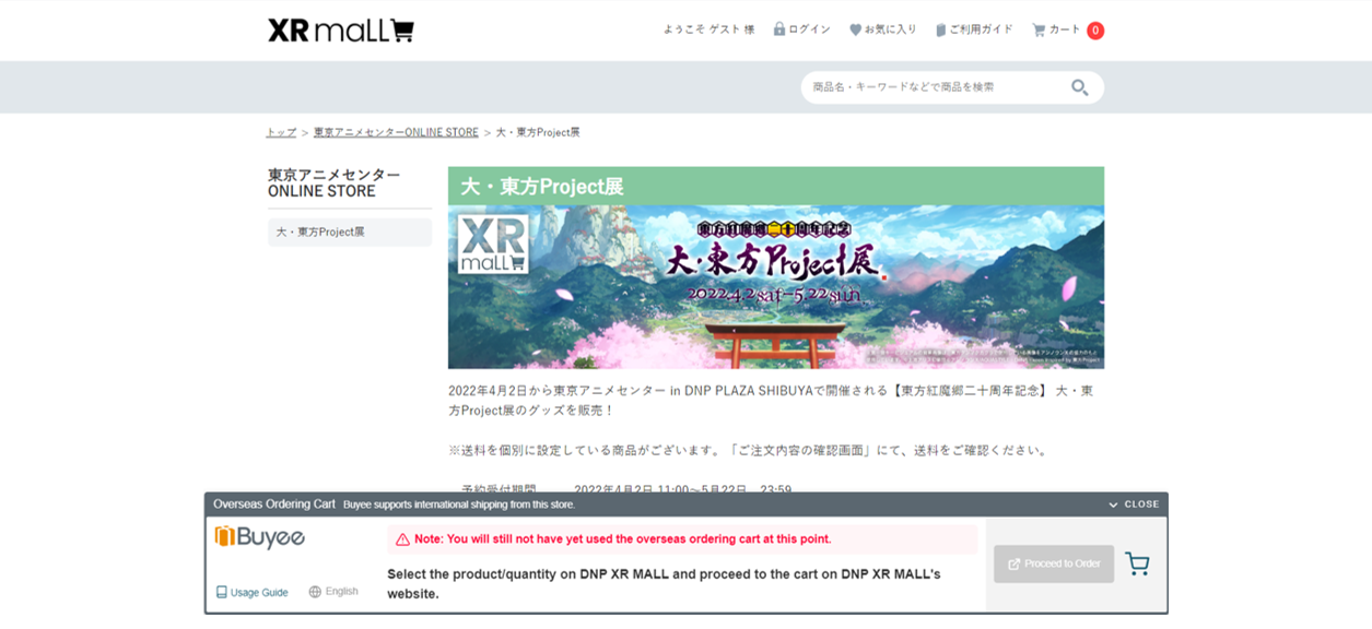 BEENOS株式会社(東証プライム:3328)の連結子会社で、越境EC 流通総額 No.1(※1)の海外向け購入サポートサービス「Buyee(バイイー) https://buyee.jp/」を運営するtenso株式会社(以下「tenso」)は、大日本印刷株式会社(本社:東京都新宿区、代表取締役社長:北島 義斉、以下「DNP」)が運営するECサイト「XR MALL」へ出品する、人気ゲーム「東方Project」のイベント「大・東方Project展」の販売商品(URL:https://xrmall.jp/tokyoanimecenter/dai_touhouten)の海外向け販売のサポートを開始しました。