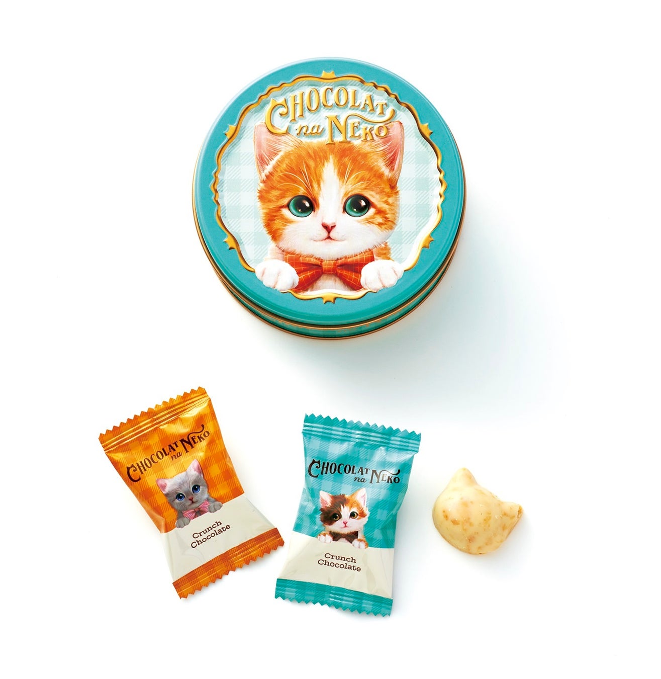 つぶらな瞳で見つめる愛らしい子猫の表情を描いたデザイン缶に、2種類の味わいのキュートな猫型クランチをアソートしました。