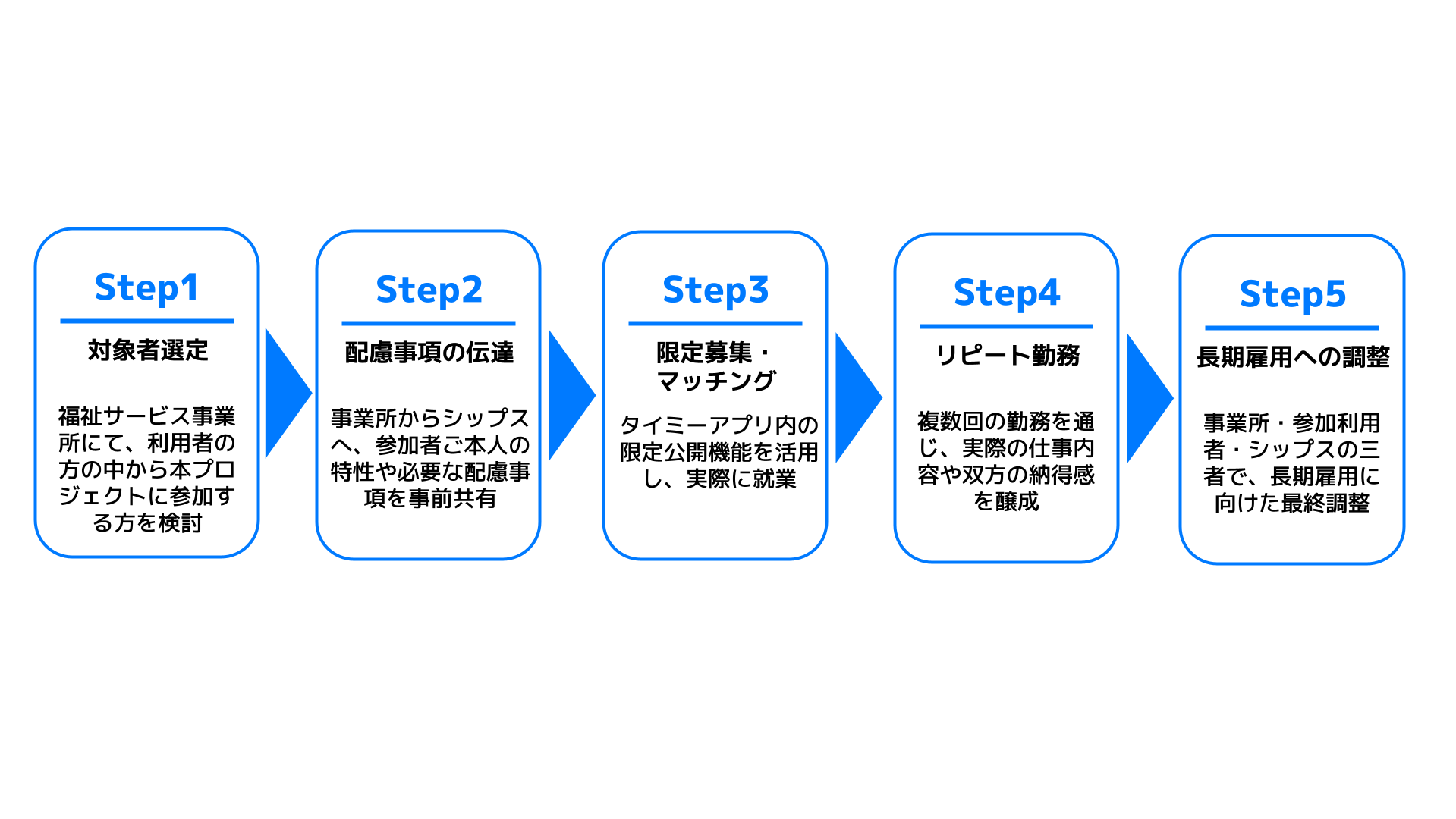 本検証では、特定の障がい福祉サービス事業所の利用者のみが閲覧・申し込みできるタイミーの「限定公開」機能を活用し、マッチング前に、あらかじめ支援機関を交えたコミュニケーションを可能にします。これによって、事前に企業がワーカー(障がい者)の障がい特性や必要な合理的配慮を十分に理解した上で適切な雇用管理を行い、ワーカーが安心して当日を迎えられる体制を構築します。