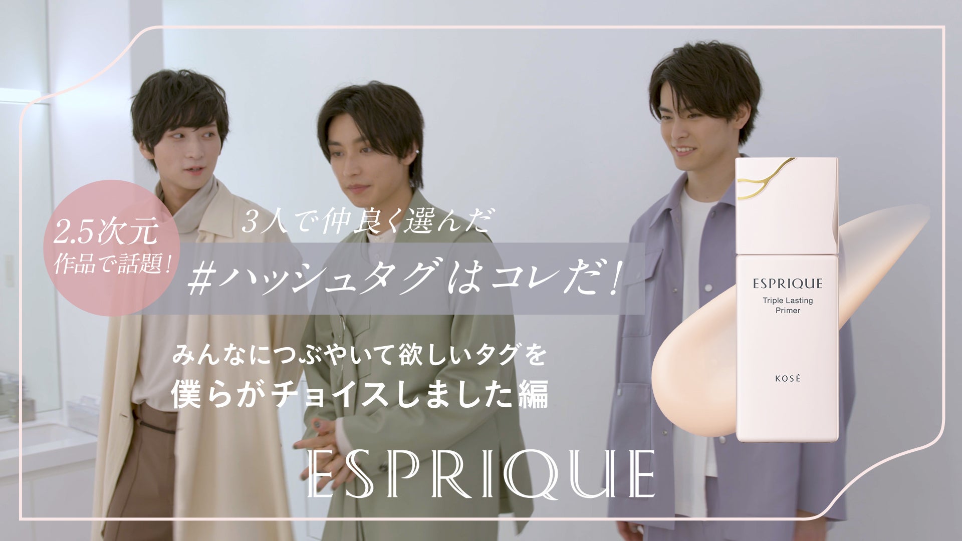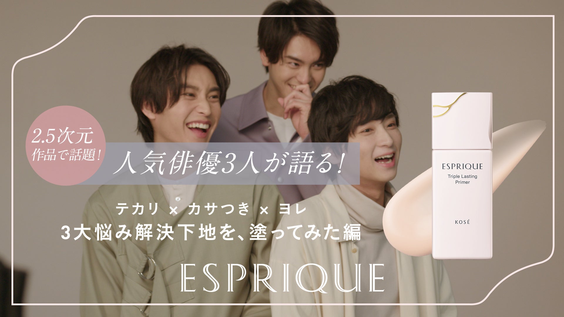 マンガやアニメを題材とした舞台作品を総称した2.5次元作品で活躍する人気俳優の3人が、ベースメイクの3大悩みである「テカリ×カサつき×ヨレ」を解決する化粧下地「トリプル ラスティング プライマー」を発売するエスプリークと、スペシャルタイアップを実施。数々の舞台・ミュージカルに出演し、普段からメイクにこだわりのある彼らも絶賛の「推し下地」である「トリプル ラスティング プライマー」の魅力をたっぷりお届けします。