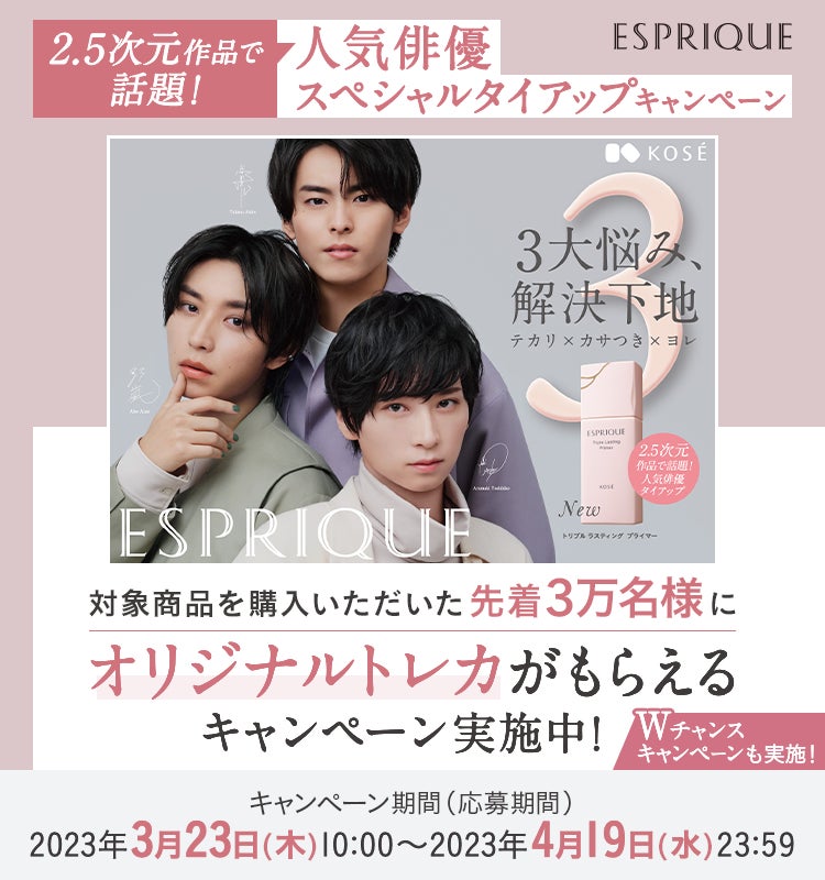 株式会社コーセー(本社:東京都中央区、代表取締役社長:小林 一俊)は、マス市場向けメイクブランド『エスプリーク』と、2.5次元作品でも人気の荒牧慶彦さん、高野洸さん、阿部顕嵐さんとのスペシャルタイアップを実施にあたって、3月16日に発売する「エスプリーク トリプル ラスティング プライマー」を購入するとオリジナルトレカがもらえるキャンペーンの詳細を公開します。