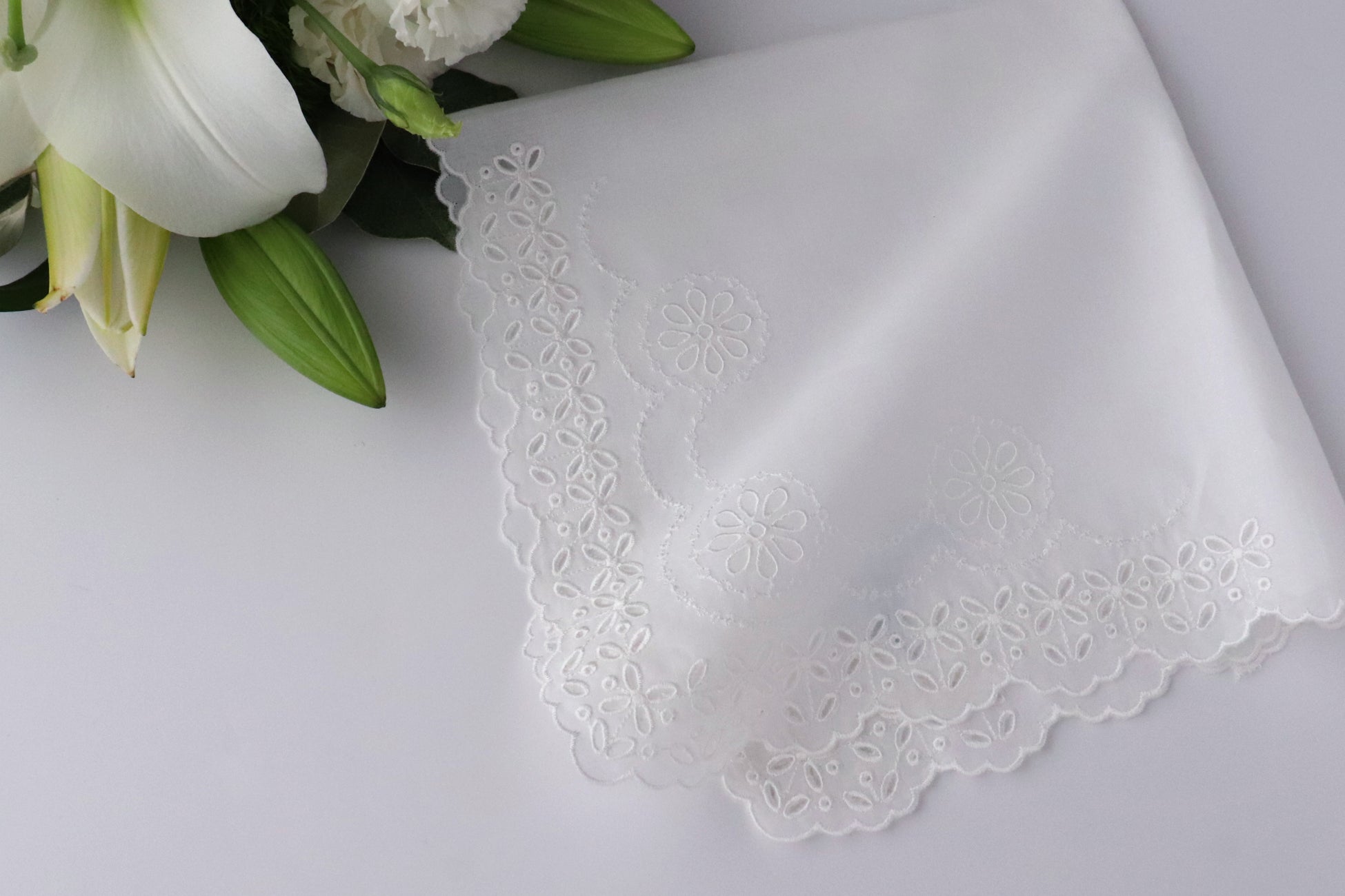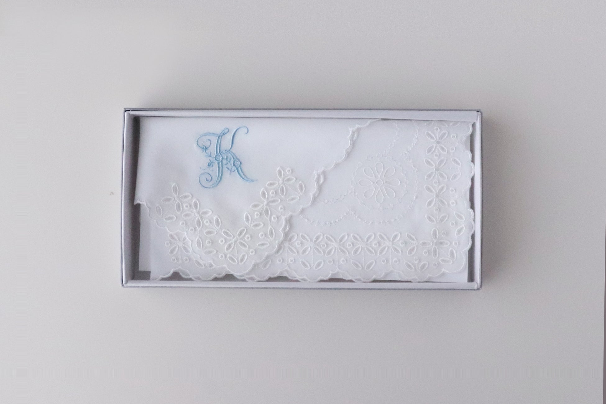 パーフォレーション(穴あけ)と繊細な刺繍がリズミカルに並ぶ純白のハンカチーフ。 古典的なデザインに、モダンな軽やかさをそっと纏わせました。透かし模様のように軽やかに、白い布の上に咲く小さな花々。 可憐なだけでなくフォーマルシーンを格上げする静かな品を感じさせます。