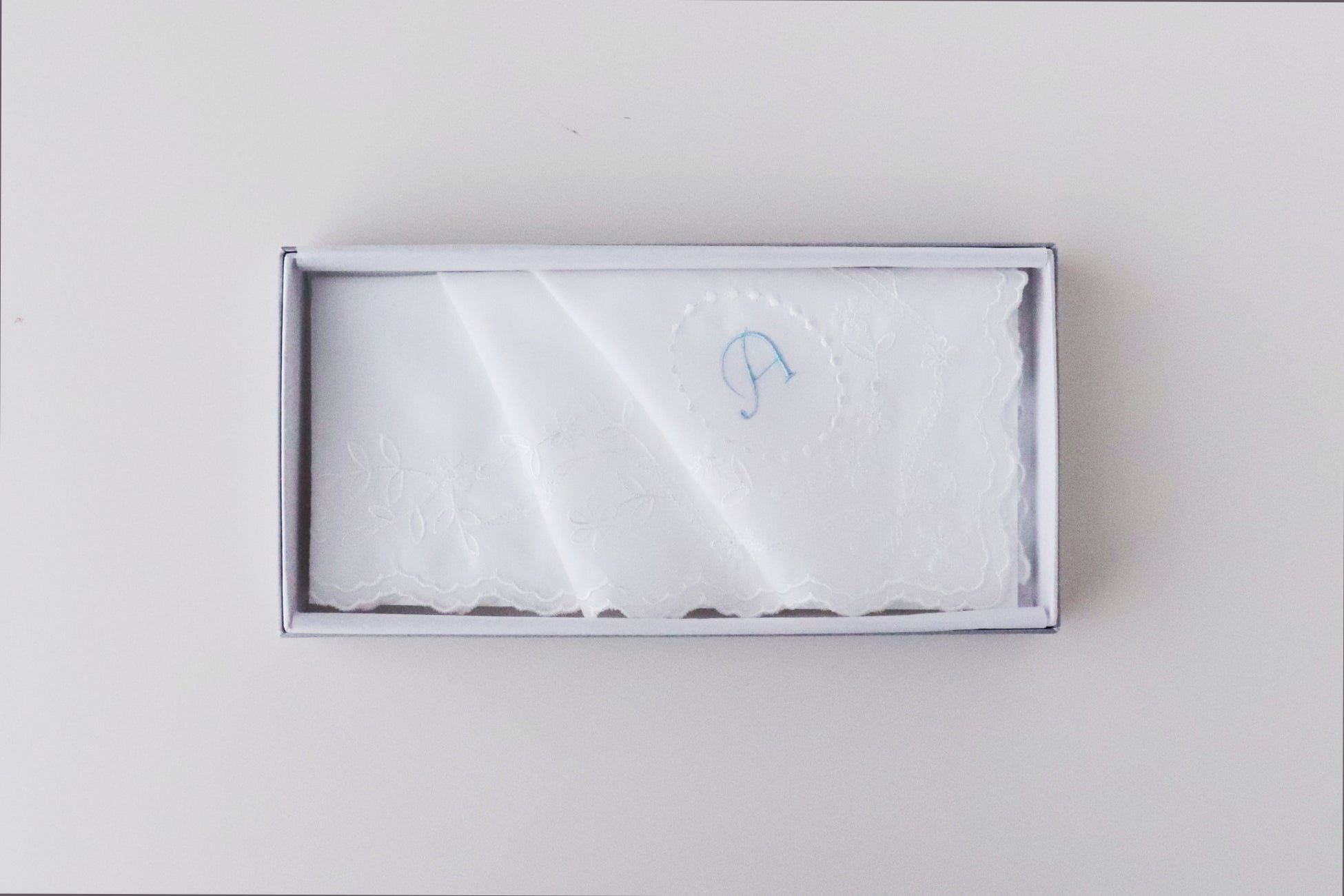 ご両家の顔合わせの場にご用意する「結ギフト」に。結婚式の当日はもちろん日常でもお使いいただけるハンカチーフは贈り物にぴったりのアイテムです。結ギフトをお求めの際は、紙箱に「水引梅結び」をご用意しております。