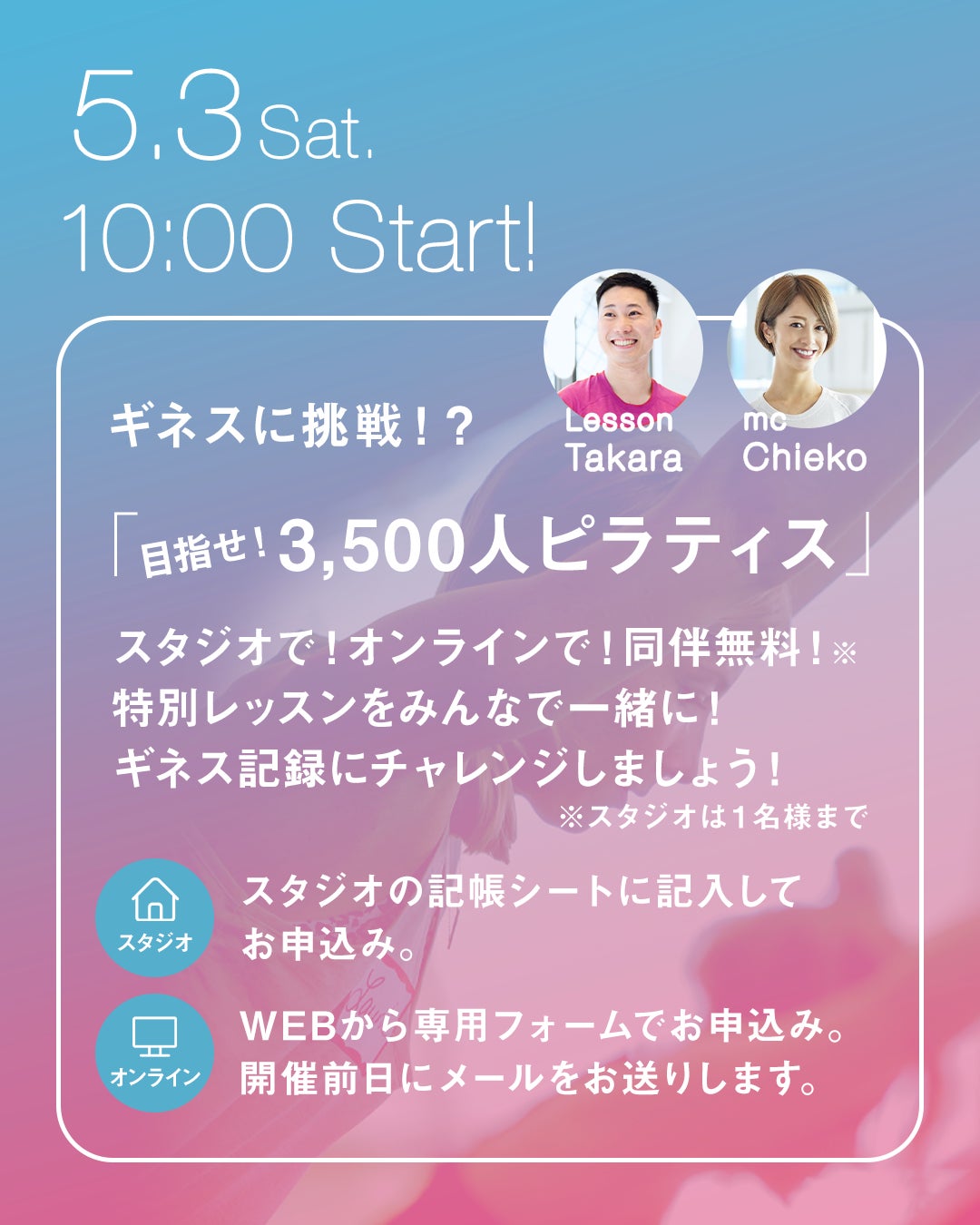 全国のスタジオ、そしてご自宅や旅行先をオンラインでつなぎ、会員様、非会員の方、エデュケーターも一緒になってピラティスを楽しむ特別レッスンを提供します。この日だけの特別レッスンを楽しみ、一緒にギネス記録に挑戦しましょう!