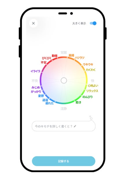 「こころログ」は、1日1回とレッスン前後に1回ずつ、円形に配置した円環図の中から、自分の今の感情(覚醒、不快、快、不快)を1タップで簡単に記憶することができます。日々の感情の記憶をすることで、自分の心の変化に気付くことができ、心の整理ができる機能です。