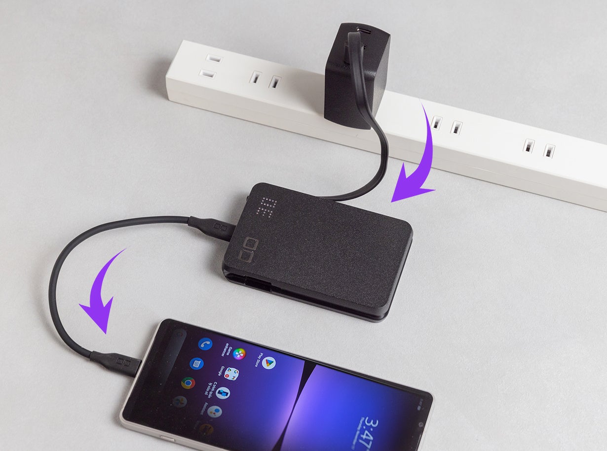 スリムだからこそ、スマホと重ね持ちしても手の収まりが良く使用感抜群。いつでもどこでも簡単に充電ができます。