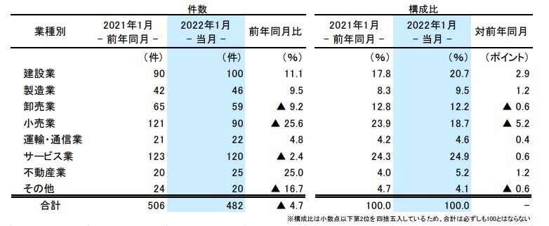 - 業種別にみると、7業種中4業種で前年同月比増加。建設業(前年同月90件→100件、11.1%増)は、資材価格や労務費の増加などにより、2ケタ増。一方、小売業(前年同月121件→90件、25.6%減)では、飲食店(同48件→33件)が過去最長となる8カ月連続の減少