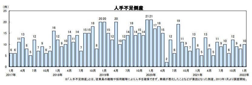 人手不足倒産:10件(前年同月8件、25.0%増)発生、2カ月ぶりの前年同月比増加