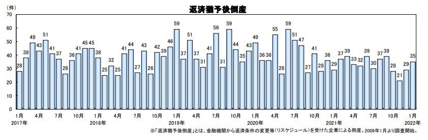 - 返済猶予後倒産は35件(前年同月29件、20.7%増)発生、4カ月ぶりの前年同月比増加