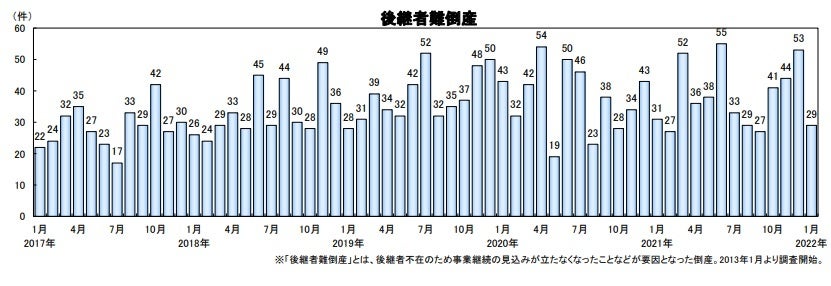 - 後継者難倒産は29件(前年同月31件、6.5%減)発生、4カ月ぶりの前年同月比減少