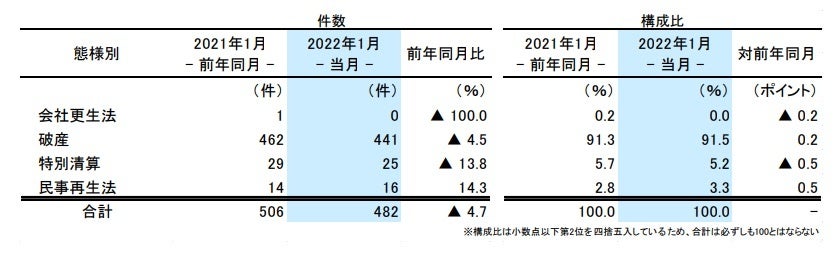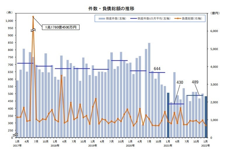 企業倒産、大幅減少トレンドに“底打ち”の兆し 今後は過剰債務企業の軟着陸が焦点に 倒産件数は482件、8カ月連続の前年同月比減少 ― 2022年1月企業倒産