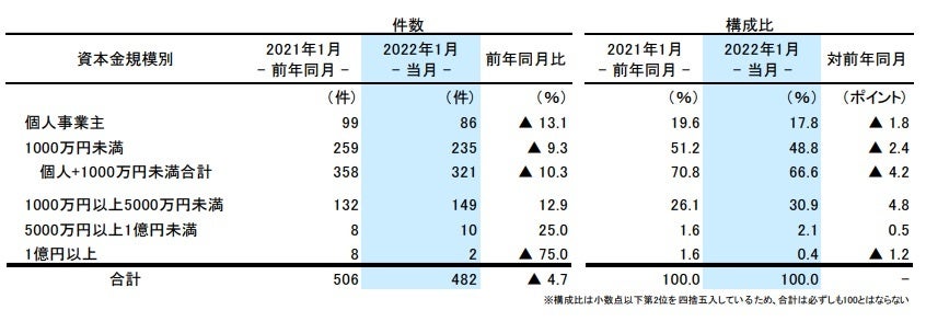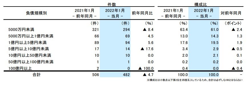- 負債規模別にみると、負債5000万円未満の倒産において、建設業(63件)が構成比21.4%(対前年同月4.9ポイント増)と、5年5カ月ぶりに20%超となった