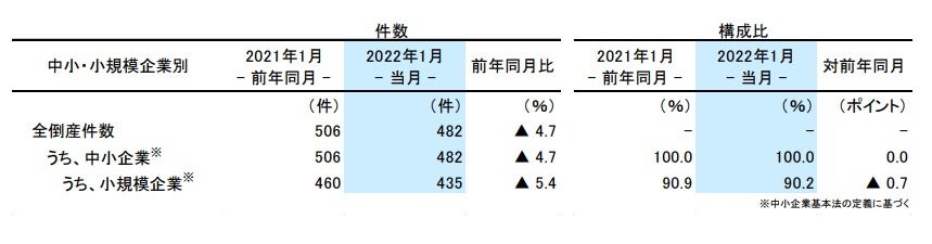 2022年1月の倒産件数は482件となった。1月としては2000年1月(354件)以来となる500件割れとなり、前年に続いて低水準でのスタートとなった。引き続き、コロナ関連の経営支援策が行きわたり、多くの中小零細企業で資金繰りひっ迫の事態が回避された状態が続いており、倒産の発生は大きく抑制された状態が続いている。ただし、前年1月からの減少率は4.7%となり、2カ月連続で減少率が1ケタで推移したほか、減少トレンドに転じた2020年8月以降、2番目に低く、21年7月の42.1%減をピークに縮小が続いている。長く続いた企業倒産の大幅減トレンドはここに来て底打ち感の兆しもみられており、年度末となる3月にかけては急増局面こそ無いとみられるものの、緩やかな反転増となる可能性も見えている。