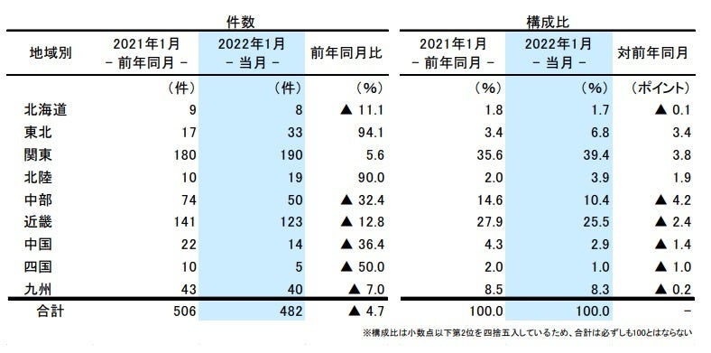 一方、関東(前年同月180件→190件、5.6%増)など3地域では、前年同月から増加した。関東では、東京都(同77件→89件)が8カ月ぶりに増加。東北(同17件→33件、94.1%増)は、建設業(同1件→11件)が大幅に増加し、全体の件数を押し上げた。