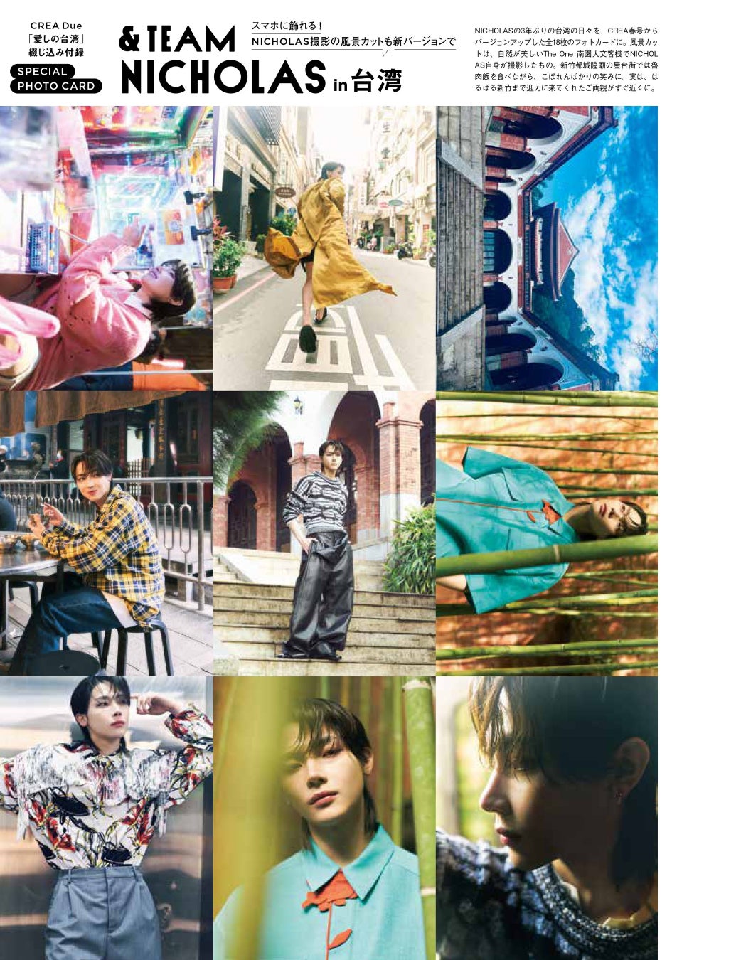 2024年春号の表紙に登場したHYBE LABELS JAPANのグローバルグループ「&TEAM(エンティーム)」の台湾出身メンバーNICHOLASは、今回のムックでは表紙、裏表紙のW表紙に登場。さらに春号でも好評だったスペシャルフォトカード付録「&TEAM NICHOLAS in台湾」は、NICHOLASが撮影した未公開の台湾の風景カットなど6カットを追加し、両面カラー全18カットの豪華新バージョンになりました。