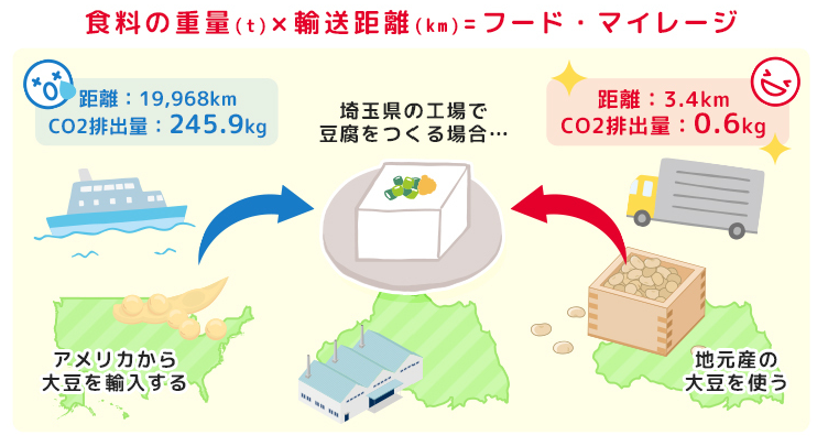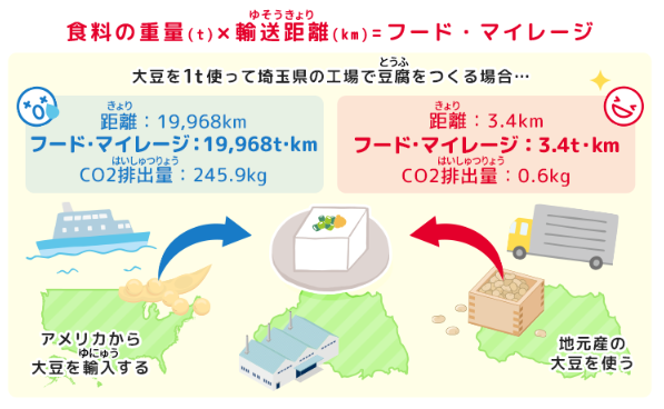 食料輸送に伴う環境への影響を示す「フード・マイレージ」という指標があります。フード・マイレージは、「生産地から食卓までの距離が短いほど環境負荷が少ない」という仮説を前提にした考え方で、“食料の重量(t)×輸送距離(㎞)=フード・マイレージ”で表されます。