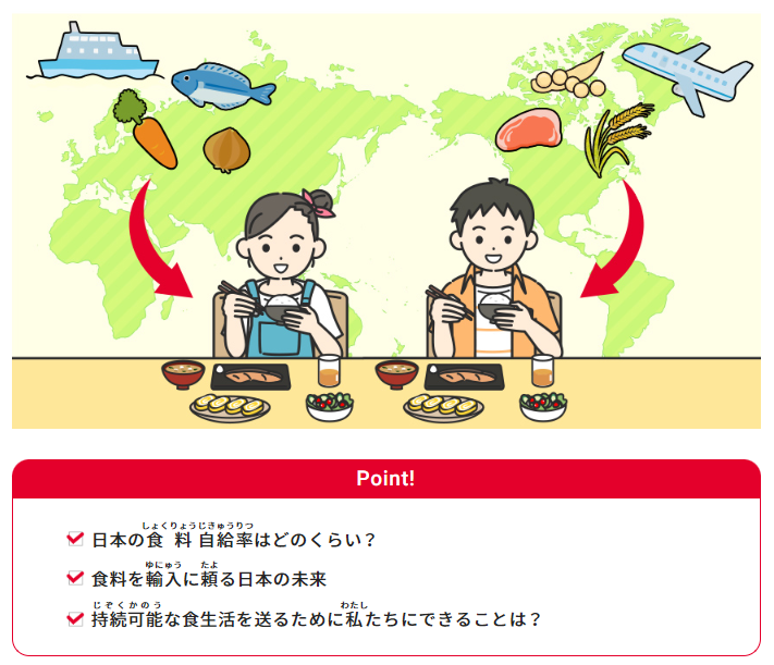 今回は、日本の食料自給率の低さを背景に、フード・マイレージや地産地消について学べる内容です。食を取り巻く環境が大きく変化している時代に、子どもの頃から食に関する正しい知識を身に付けることで、課題に対して何ができるかを考えてほしいという思いで制作しました。