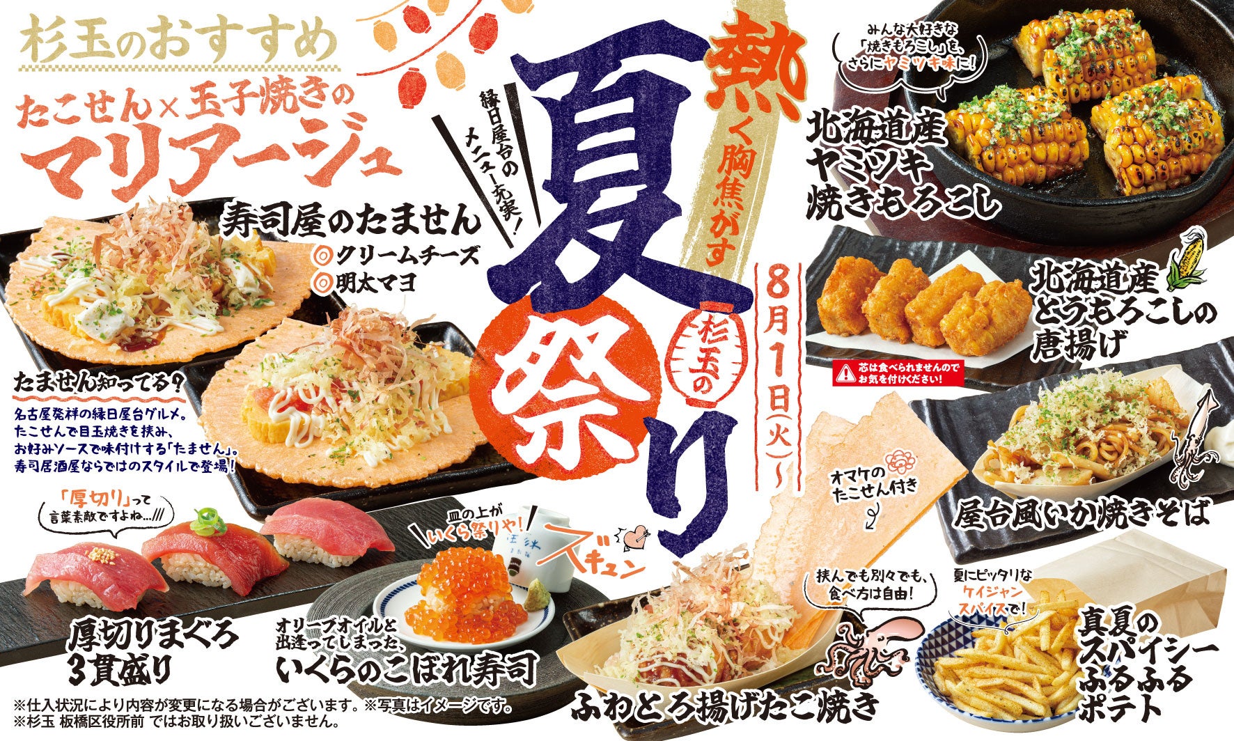 大衆寿司居酒屋「鮨 酒 肴 杉玉」、屋台メシに熱く胸焦がす『杉玉の夏祭り』を開催!定番の“たこ焼き”や“焼きそば”、“たません”など縁日屋台メニューが集結。<8月1日(火)から全国の杉玉で販売開始>