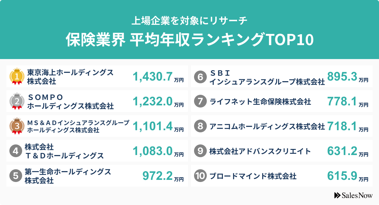 保険業界、平均年収ランキングTOP10を発表!/SalesNow DBレポート