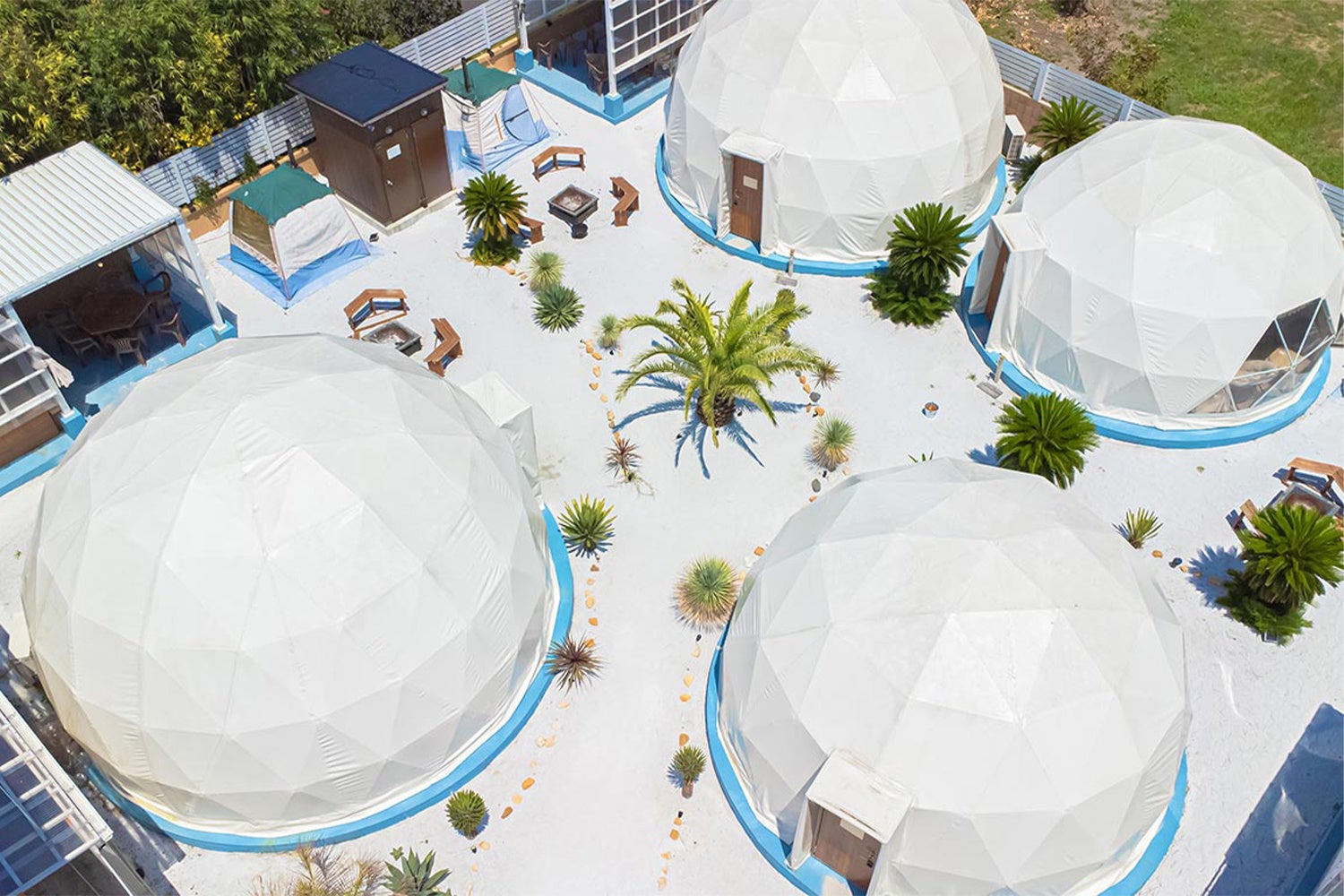 千葉県を代表するグランピング&リゾートグループ「THE BONDS」では、⽩い砂浜と広⼤な⻘い海を⼀望できる絶景の中、ドームテント型やヴィラ型の客室を⽤意し、特別なリゾート体験をご提供しています。