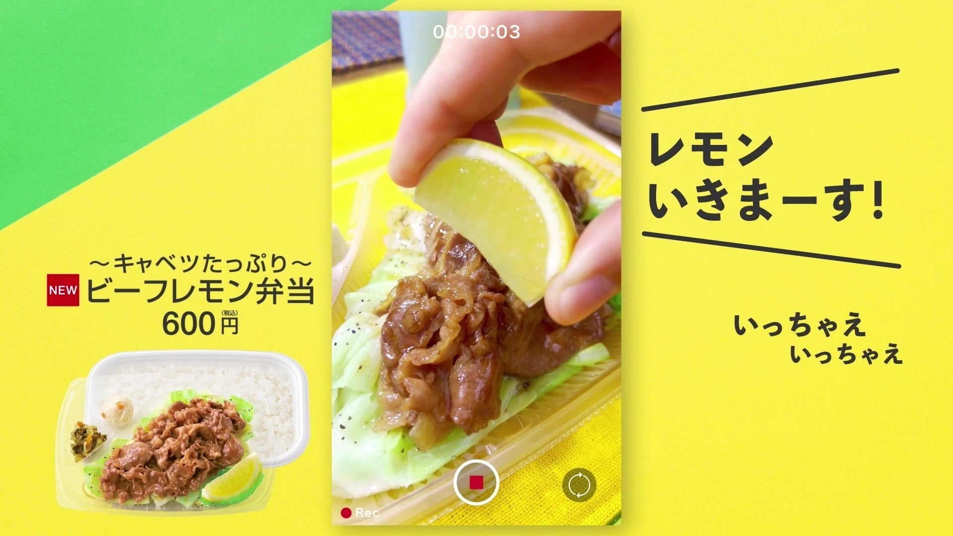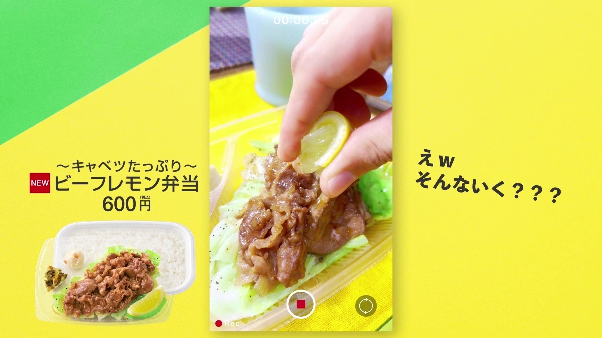 友人同士の賑やかな食事シーンの中で、スマホで撮影する様子や、会話を通して『~キャベツたっぷり~ビーフレモン弁当』の魅力を訴求しています。主人公がレモンを絞り、お肉を口に運ぶと、思わず「さっぱウマ!」と声を出してしまいます。その後の「さっぱりと美味いね!」という友人とのやり取りが、楽しさを演出しています。こちらのCMは実際にスマホで撮影した映像をそのまま使用することで、リアルな表現にこだわりました。
