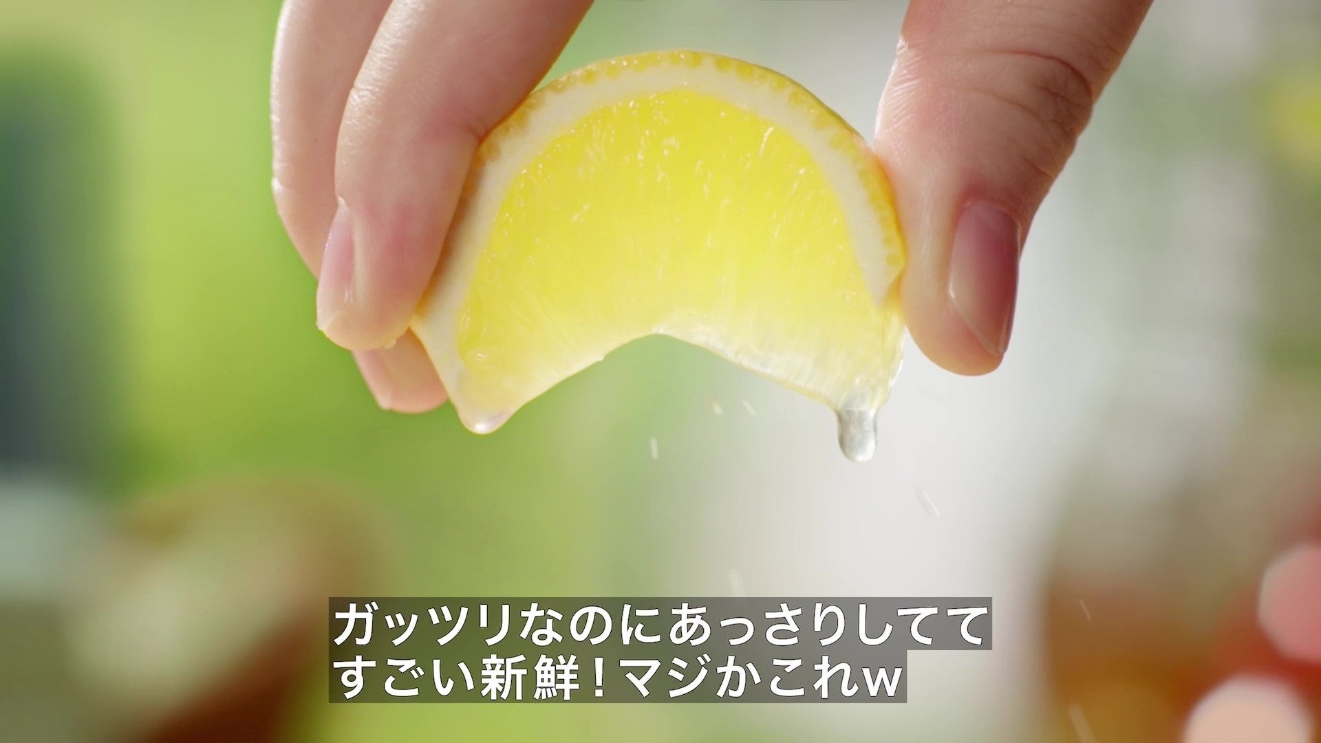 本醸造醤油ベースのすっきりとした甘さのニンニクダレを使用して焼いた牛肉と、レモンの絶妙な相性をテンポのいい語りで訴求しています。レモンをギュッと絞るシーンの清涼感と、クセになるナレーションがポイントのCMです。