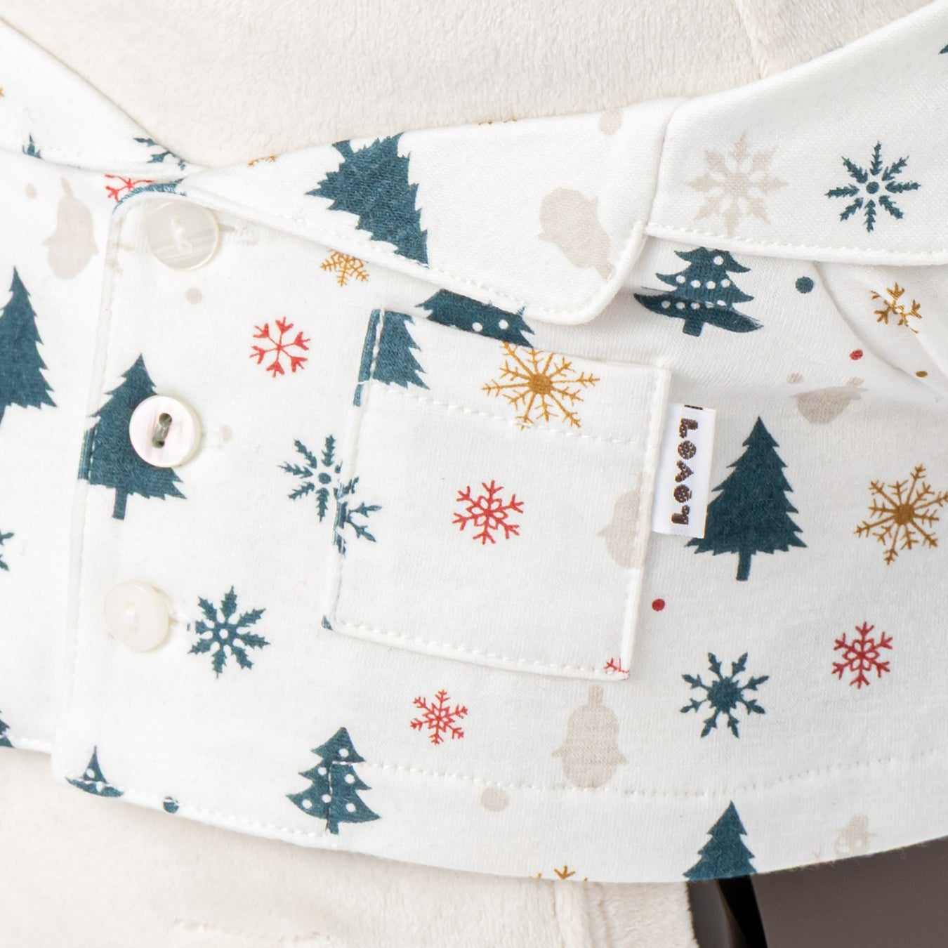 真っ白でふわふわなビジュアルがとっても愛らしい、スノーマンウェアが登場。ふわふわな雪をイメージさせる、触り心地がとても気持ちいいニット素材のベースウェアに、真っ赤なマフラーとカラフルなボタンがアクセント。小さな黒い帽子もチャーミングなポイントです。帽子とマフラーは取り外し可能で、気分に合わせた着こなしも楽しめます。