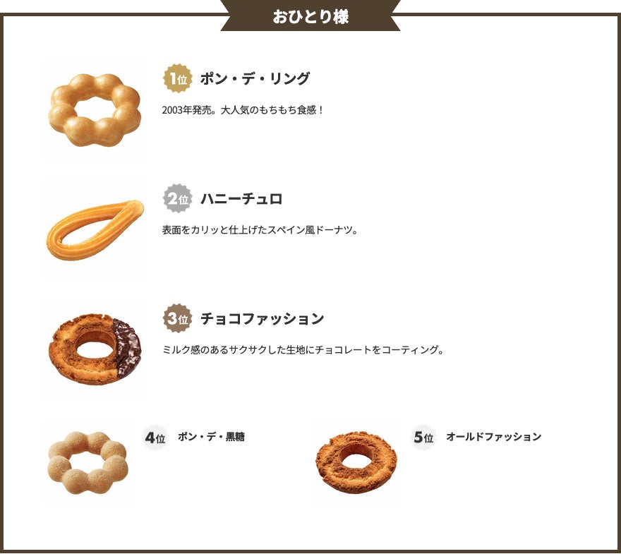 おひとり様の4位には、「ポン・デ・黒糖」がランクインしました。黒ごま、黒豆などをブレンドした黒五黒糖シュガーであっさりした甘味のある商品です。5位には1975年に発売された「オールドファッション」がランクインしました。ミルク風味と自然な甘みで、サクサク食感の定番ドーナツです。